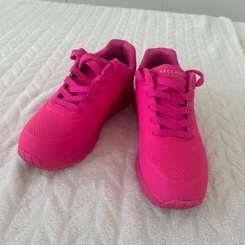 Skechers pige sneakers i størrelse 29. Skoene har en blå overdel med pink detaljer og elastiske snørebånd kombineret med en velcrolukning. Sålene er hvide med mønster for bedre greb. Materialet er tekstil og syntetisk. Velegnet til daglig brug for børn.