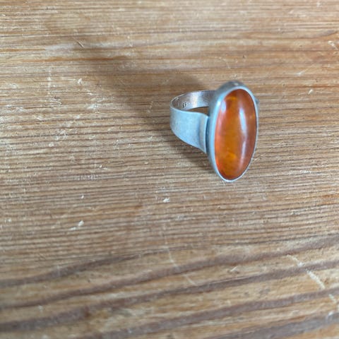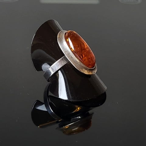 Smuk og unik antik sølvring i ægte 830S sølv med stor rav-sten.