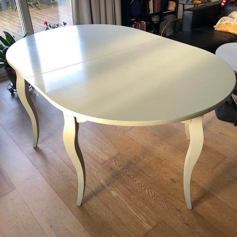 Jysk spisebord med hvid bordplade og ben i træ. Designet til at rumme op til 10 personer. Bordet har en oval form og er velegnet til spisestue eller køkken. Dette spisebord leveres med 2 tillægsplader, som kan forlænge bordet fra 190 cm til 270 cm