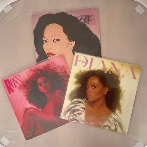 Diana Ross Eaten Alive vinylplade med sange som 'Eaten Alive', 'Chain Reaction' og 'Experience'. Pladen indeholder to sider med flere numre og er i standard vinylformat.