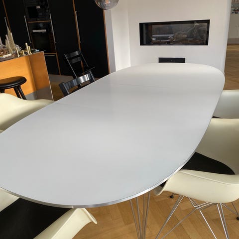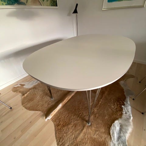 Piet Hein 1905-1996 & Bruno Mathsson 1907-1988. Super Ellipse spisebord, hvidlakeret bordplade monteret med spændben af forkromet stål.