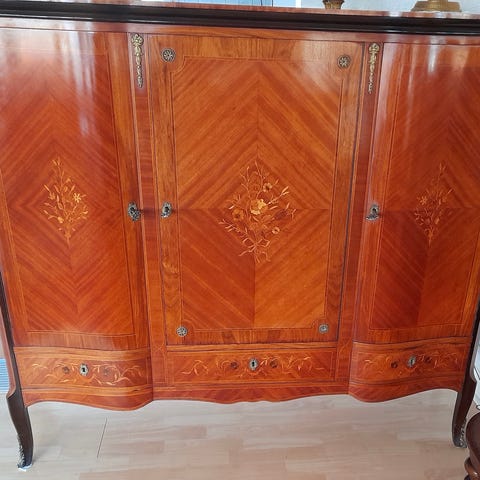 Skabet står på fire ben og har metalbeslag til lukning. Velegnet til opbevaring af småting og som dekorativ møbel.