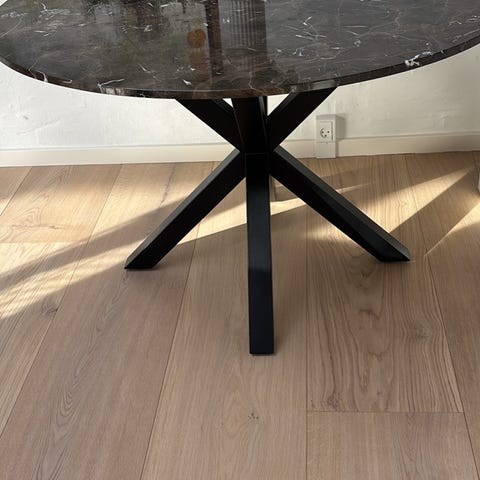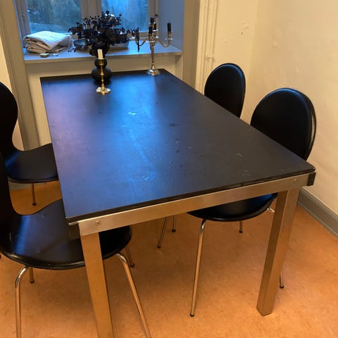 Flot granitbord i rødmeleret granit med stål stel og rustfri ben. Er meget tungt.