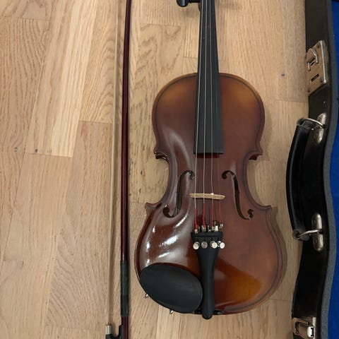 Violin med bue og robust kuffert. Børneviolin. Lille kunsthåndværk som måler 36 cm i længden. Den er beregnet til de helt små i 3-5 års alderen. Den er ikke en discount model. Inde i voiolinen står der: Conservarte Etude - Antonius Stradivarius Cremonensis - Faciebat Anno 1725 og håndskrift 018F, hvilket må være serie nummer. Det er ikke en original Stradivarius, bare rolig, men af samme model. En rigtig god begynder violin. Den er ca. 20-25 år gammel og velholdt, dvs. gemt i kassen. Fornuftig bud er velkommen.