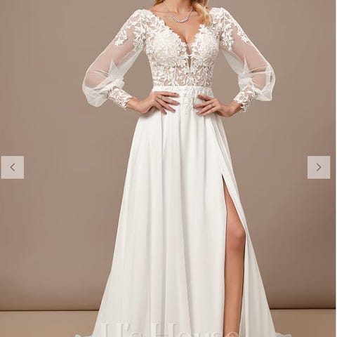 Flot brudekjole med mange smukke detaljer, flere lag i forskellige længder og langt slæb. Der er lynlås i ryggen, men denne er skjult bag fine knapper.