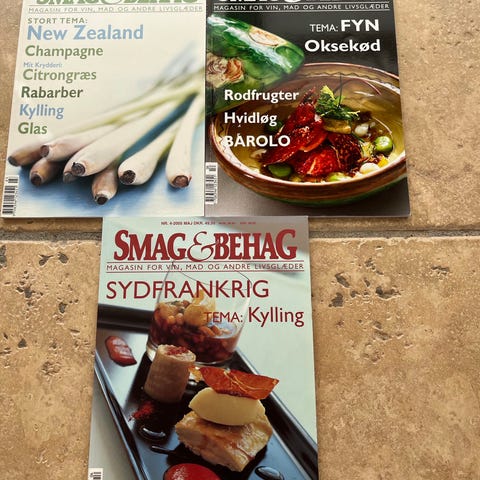 Smag & Behag, Magasin, magasin for vin, mad og andre livsglæder. Magasinerne er som nye. Det er flg. nr. og årg.: Nr. 2/1998, nr. 3/1998, nr. 5/1998, nr. 1/1999, nr. 2/1999, nr. 5/1999, nr. 9/2010, nr. 1/2000, nr. 2/2000, nr. 3/2000. Sendes gerne, hvis køber betaler porto. Stk. pris fra 20 kr.