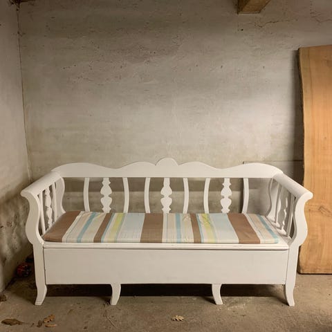 Hyggelig hvid slagbænk med patina og med opbevaring under hele sædet. Stoffet på sædet trænger nok til at blive skiftet.
