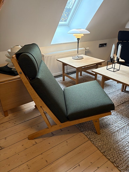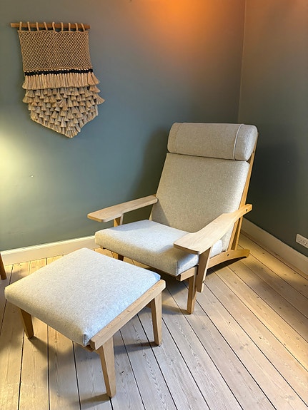 Hans J. Wegner GE240 lænestol & skammel i eg med nyt hyndesæt