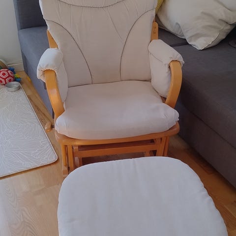 Super lækker ammestol fra QUEEN. Modsat mange andre ammestole, har modellen håndtag i siden til at justere ryglæn frem eller tilbage og et håndtag til at låse stolen, så den ikke kan gynge. Fodskamlen kan også gynge.