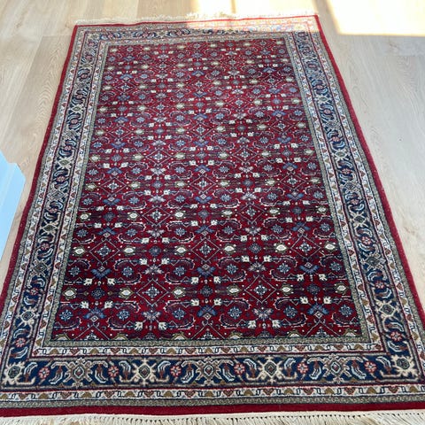 Ægte tæppe har ligget under sofabord, billede 1-2 viser bagsiden. Tæppet måler 130x200 med frynser.