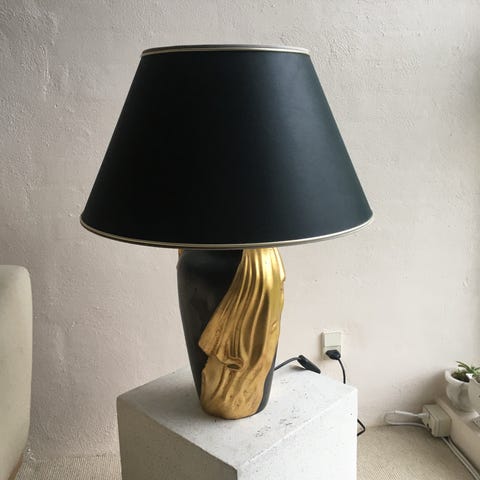 Spændende bordlampe , sort skærm m guldsnor, tekster??? Der er ikke nogle der passer