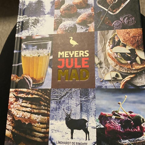 Meyers Jul bog med orange omslag. Indeholder opskrifter og information relateret til jul. Bogen er på dansk og egnet til brug i køkkenet under juleforberedelser.