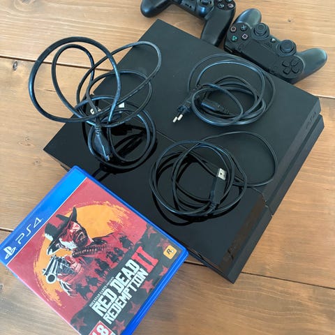 En PlayStation 4 med en controller + God of War og The Witcher 3, begge som Game of The Year Editions.