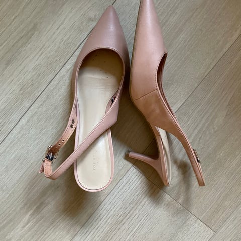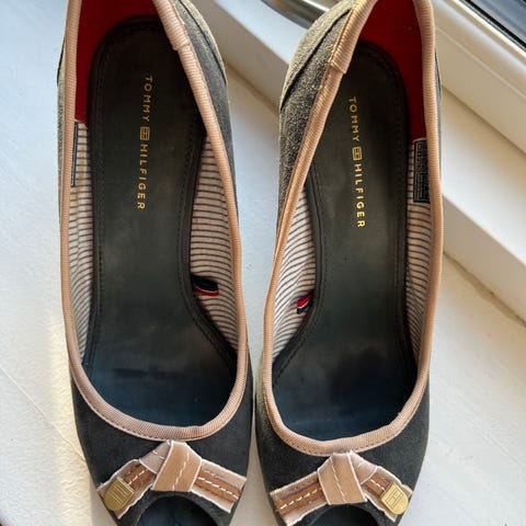 Tommy Hilfiger højhælet sko i størrelse 39. Skoene er beige med en kilehæl og har en rem til fastgørelse omkring anklen. Materialet ser ud til at være en kombination af stof og ruskindslignende materiale. Velegnet til formelle og afslappede lejligheder.