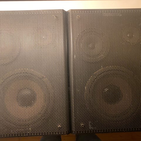 Kompakt reolhøjttaler i sort bejset træ med sorte stoffronter.