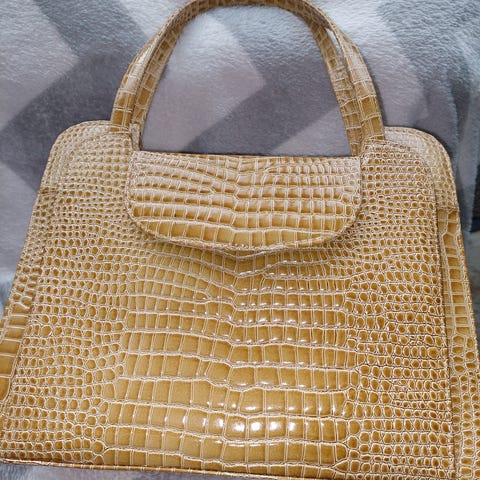 Dame Håndtaske med målene 28 cm i højden og 13 cm i bredden, sort farve og lavet i materiale med krokodillemønster. Tasken har to håndtag og et rum, der kan rumme forskellige daglige nødvendigheder som iPad, paraply, vandflaske, oplader, kosmetik, læbestift, parfume, mobiltelefon, pung og kort.