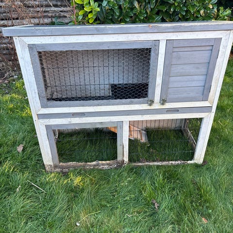 Træ kaninbur til udendørs brug med to niveauer, rampe til adgang mellem niveauer, trådnet sider for ventilation og adgangsdøre. Buret er velegnet til små kæledyr som kaniner eller marsvin og har plads til indendørs og udendørs ophold.