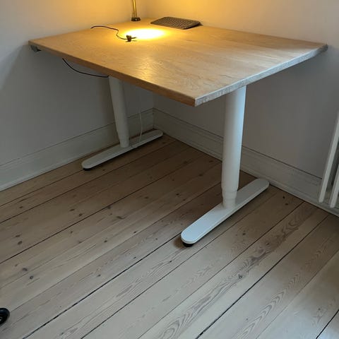 Sælger dette unikke hæve sænkebord. Eget design med en blanding af en massiv live edge plankebordplade i massivt eg og et solidt og velkørende stel.