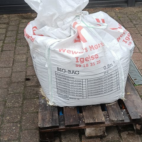 Sælger en næsten helt ny Big Bag Strandmørtel. Der er kun taget en minimal mængde til et projekt hvor der skete fejllevering, og der derfor ca. 950-1000 kg / 450 L tilbage. Mørtlen blev leveret midt september.