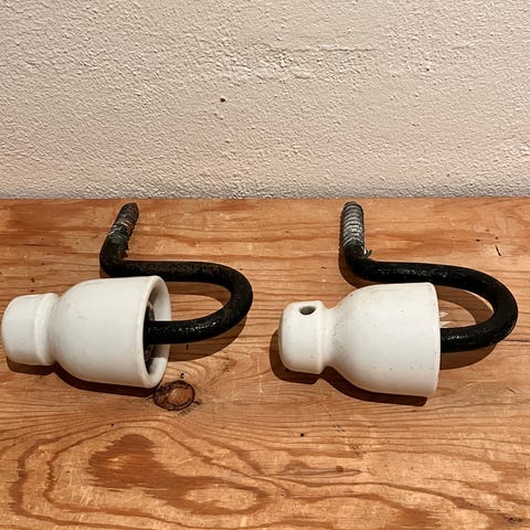 El klokker fra gamle elmaster den en er sort på ca. halvdel, den anden er der et stort skår i. Begge sælges for 60 kr. eller 1 stk. for 50