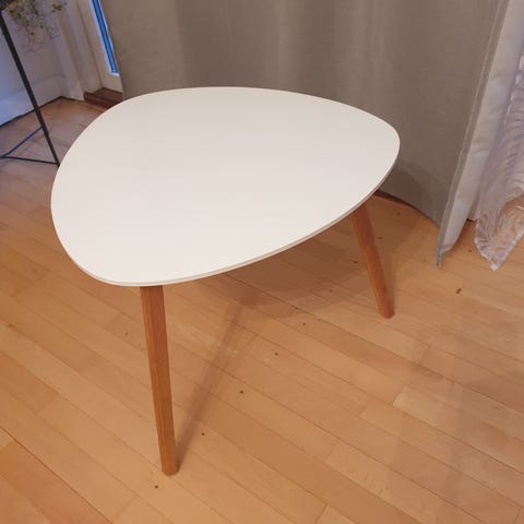 Solidt hvidt træbord måler B59xD50xH50 cm. Lidt skrammet på bordpladen. Eller god stand.