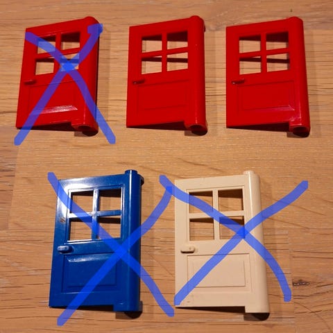 #LEGO System, løsdele, tilbehør, klods, dør, vindue, gul, rød