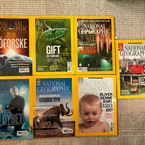 National Geographic, Blad, 10 magasiner som nye. Årg. 2008 nr.12 og 14, årg. 2009 nr. 2, 6, 7, 8 og 9, årg. 2010 nr. 11, årg. 2011 nr. 4 og 5. Alle 10 magasiner sælges for 200kr. + porto, hvis bladene skal sendes. Pris pr. stk. 25 kr.