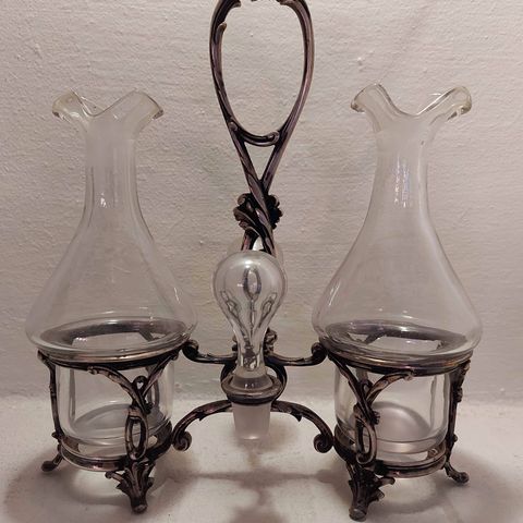Eddike / olie sæt, i glas og "sølv" antik. Passer lige til opdækning med musselmalet. Set i serien badehotellet
