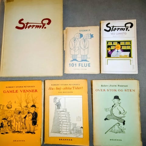 Storm P. 4 bøger, Gemytlige Folk 1944, 220 sider. I fred og ro, 1945, 176 sider. Over Stok og Sten, 1946, 174 sider. 13 øre - alt iberegnet og 46 andre fortællinger, 1955, 288 sider. Branners Forlag, 1.og 2.oplag, illustreret i sort/hvid, hæftet, originalt omslag, Over Stok og Sten er delvis uopskåret. NB. Sælges kun samlet og sender gerne!!