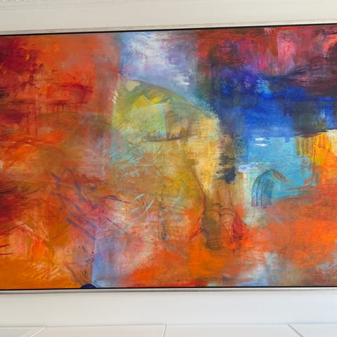 Maleri med abstrakt motiv malet af Jytte Loehr i smukke farver. Kunstværket viser to figurer i en ekspressiv stil. Passer til dekorative formål i hjem eller kontor.