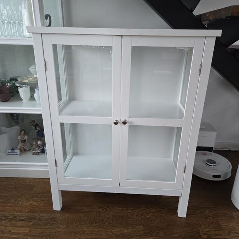 Skabet har en fin bagbeklædning, hylder og glas på kortsiderne.