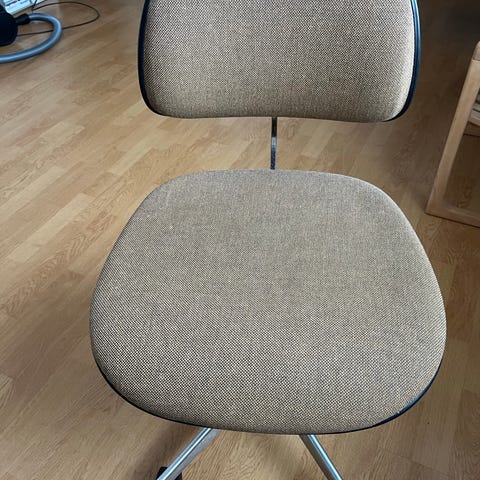 Blå Labofa kontorstol med synlige brugspor på sæde og rygstøtte, men den fungerer stadig helt fint. Højden kan justeres, og sædet kan også justeres, så det vippes.
