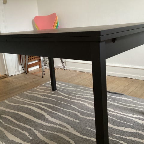 On a String bord fra OK Design med sort linoliumsbordplade. 200x90x74. Læs mere om bordet her www.okdesign.biz/product/oas-table/. Har almindelig slid og afmærkninger, se billedet. Kan evt fjernes med linoliumrens og linolie. Skal afhentes i Borup ml Roskilde og Ringsted.