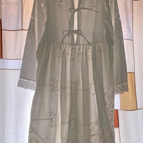 Fantastisk håndsyet, vintage, lang silkegallakjole, syet af Jørgen Bender og Werner Engquist fra Holger Bloms systue. Kjolen er også velegnet som brudekjole. Lysegrøn silke med mange håndsyede blomsterapplikationer. Denne kjole er et kostbart unikastykke og liebhaveri for den kvinde, som påskønner en enestående kvalitet og som ønsker at eje en feminin brude/selskabskjole ud over det sædvanlige. Kjolen har været meget kostbar at fremstille og har kun været anvendt 2 gange