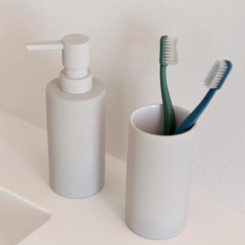 Det tidløse farvespil i hvid og beige skaber et rent og harmonisk udtryk, mens den kompakte størrelse gør sættet ideelt til både praktisk brug og dekorativ opstilling på badeværelset.