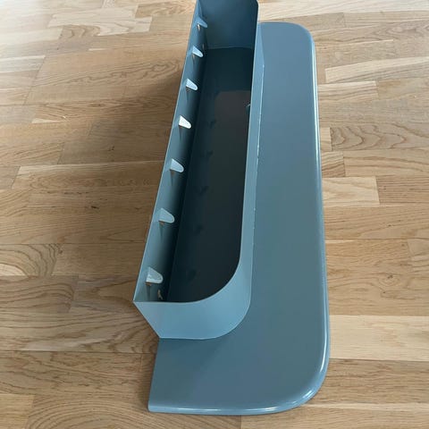 Korpus Shelf is a series of colorful wall-mounted shelves created for HAY by Norwegian product designer Andreas Bergsaker. Based on the desire to create a durable multi-purpose shelf from recyclable material, Korpus Shelf is made from sheet aluminium, known for its lightness, strength and ability to be reused countless times. The aluminum undergoes an industrial stamping and punching process to be formed into the distinctively curved column and top. Keyhole slits at the back facilitate mounting, while concealed hooks in the column provide additional hanging possibilities. These versatile shelves can be used in many different rooms in the home, such as a coat rack in the hallway, storing kitchen utensils, hanging bathroom towels or displaying ornaments in the living room.
