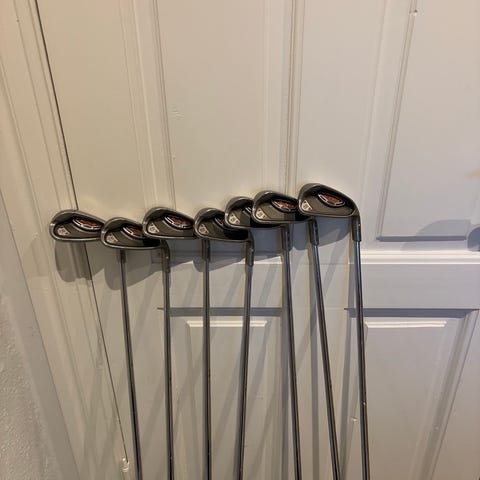 Power Tornado golfjern sæt med jern nummer 5 til 9, pitching wedge (P) og sand wedge (S). Sættet har røde skaft og sorte greb. Designet til brug af golfspillere, der ønsker et komplet sæt jern til forskellige slag. Samt to drivere