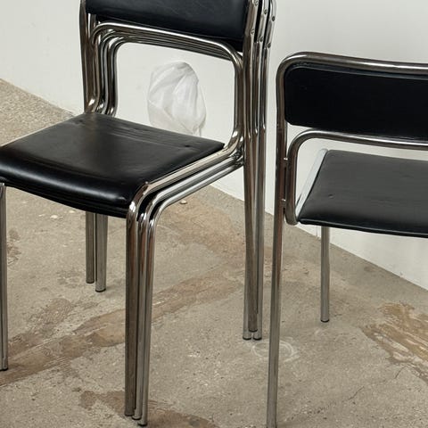 Stolene har klassiske brugsspor, der giver dem karakter og vidner om alder. Undersiden er færdiggjort med sort stof (se billede).