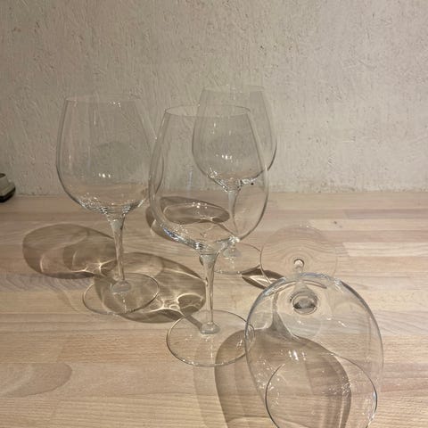 6 rødvinsglas 22 cm høje. Meget plads til at svinge og lufte vinen, da glassene har en stor volume.