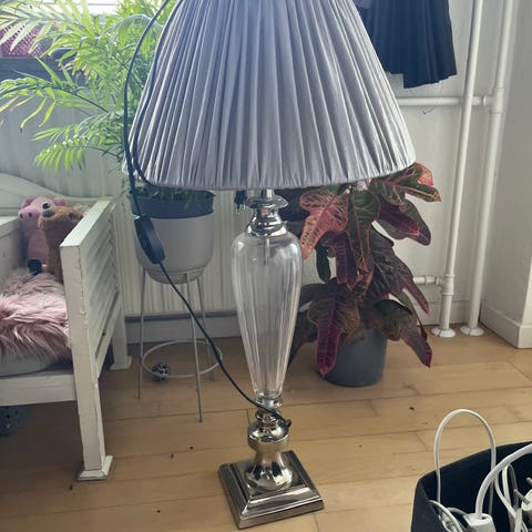 Iittala bordlampe med en dekorativ skærm med tekst og våbenskjold. Lampen har en detaljeret base i metal med antik finish og en firkantet sort fod. Lampen er egnet til brug som bordlampe i stuer eller kontorer. Højde=75 cm.