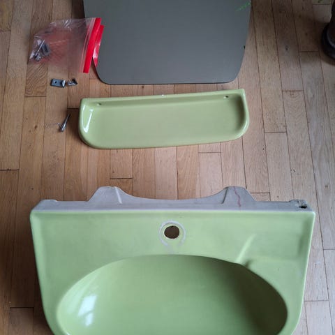 Det er et italiensk badeværelse møbel med håndvask og vandhane og rør. Det er 40. Cm dyb og 62. Cm bred og 68. Cm til bordkant og 88. Cm høj til håndvask kanten. Skal hentes. 4520 Svinninge.