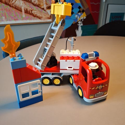 ⚠️ Bemærk: Flere af klodserne på brandstationen er udskiftet med andre varianter, og de store porte mangler. Men sættet er fint og fuldt funktionelt til leg.