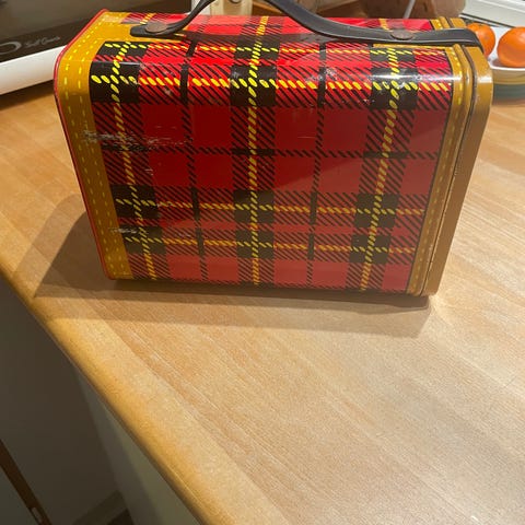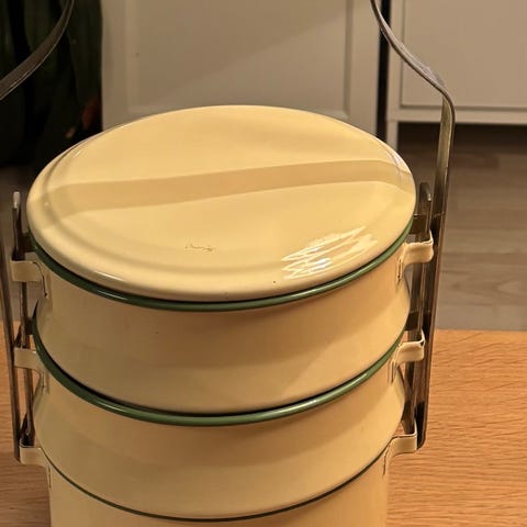 Blev brugt til at transportere et varmt måltid mad bl.a. ud til manden i marken som frokost. Indrettet med 3 rum til henholdsvis kød, sovs og kartofler. Et fint kuriosom, som ikke ses ret tit