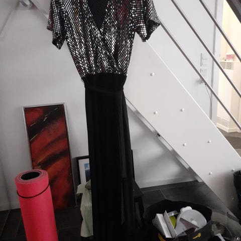 Buksedragt, Selskabs buksedragt, Tilhørende skulder-varmer, str. 40, Sort, Polyester, Næsten som ny, Buksedragt med top af satin. Der er guld -nister fordelt over hele dragten, som giver den et fornemt look. Der er tilhørende løs top. En meget fin festdragt, som kan bruges til enhver lejlighed. Flere fotos kan sendes. Varen kan sendes.