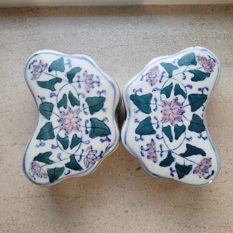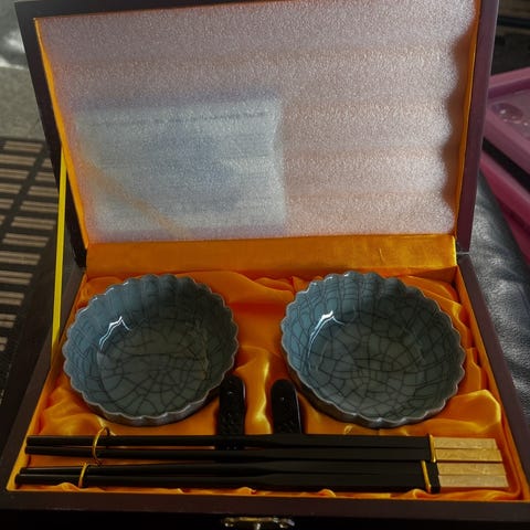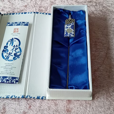 Æsken har nok været traditionelt i kinesisk kalligrafi og maleri til at holde papiret fladt. alt er håndlavet og glasset er virkeligt fint farvespil.