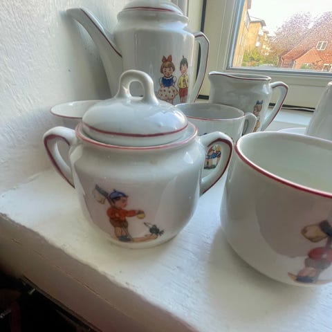 Dukkestel fra 1960’erne i perfekt stand, har guldkant og et sødt bamsemotiv.