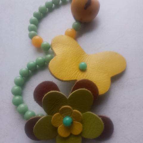 Fik min veninde til at lave dette armbånd men har kun haft det på en gang. Lyselilla perler og mørkebrun fake læder snor
