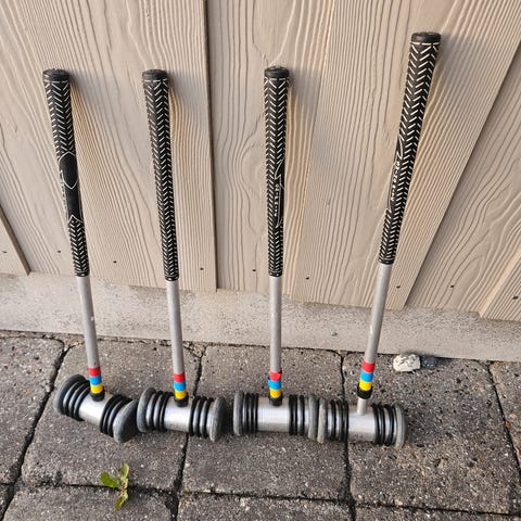 Kroket, kroketkøller, meget flotte håndlavede og professionelt udførte kroketkøller til konkurrencebrug, fremstillet af limtræ (mahogni/bøg/ask), 3 lag klarlak, monteret med dobbeltlags gummi og nylon. Skaft isat med stødabsorberende lim.