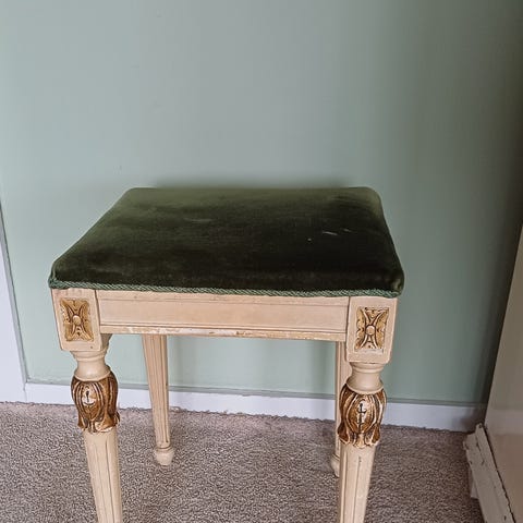 Skammel med pulet plads, b: 31 d: 58 h: 47, Flot antik skammel med flot broderet aftageligt sæde . Det er muligt at løfte selve sædet, så der mulighed for at bruge den som opbevaring på en stilfuld måde .