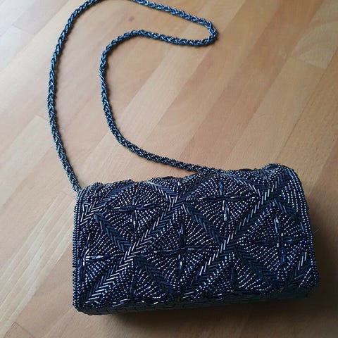 Festtaske, andet mærke, andet materiale, En elegant festtaske med håndsyet sorte perler. Hele tasken er af perler udvendigt og hanken er også lavet af perler. En solidt, rumlig meget smuk festtaske. Hanken kan ikke tage af.